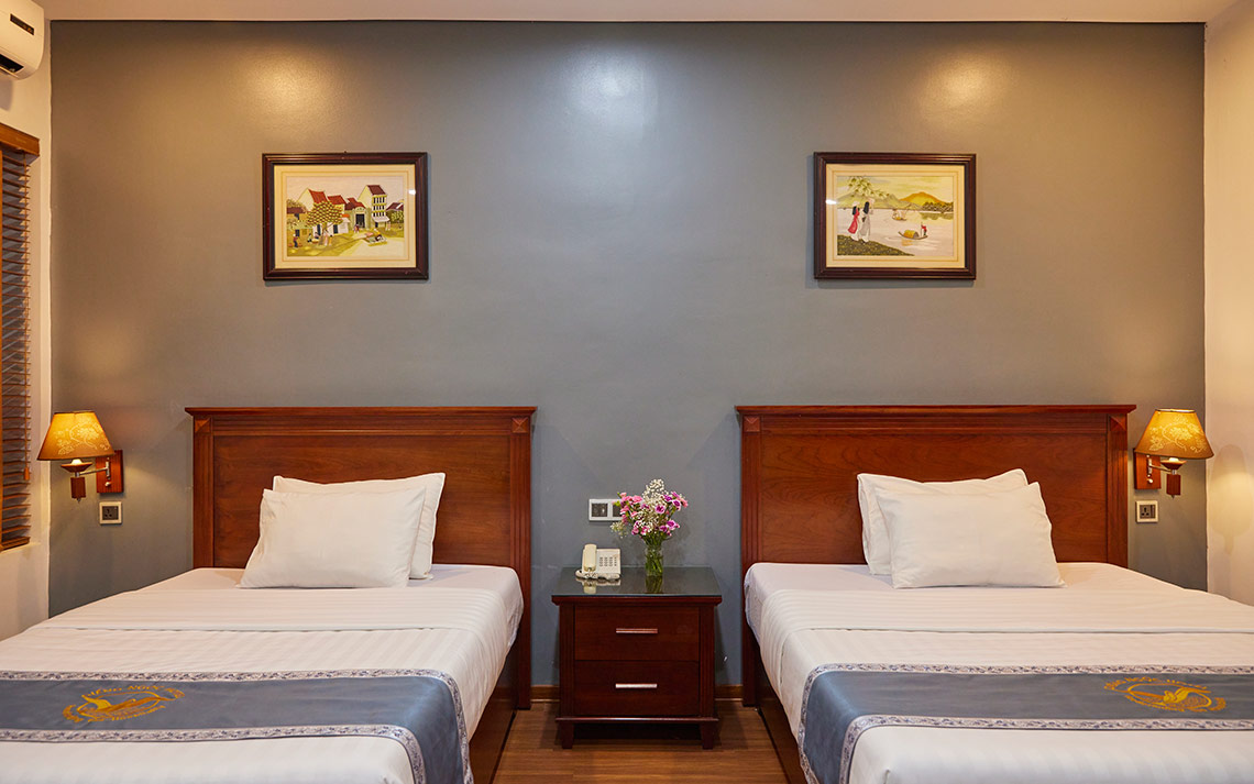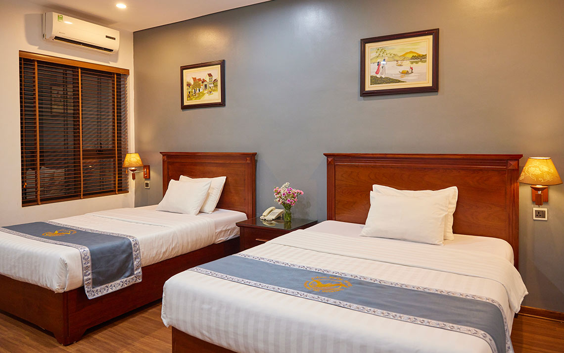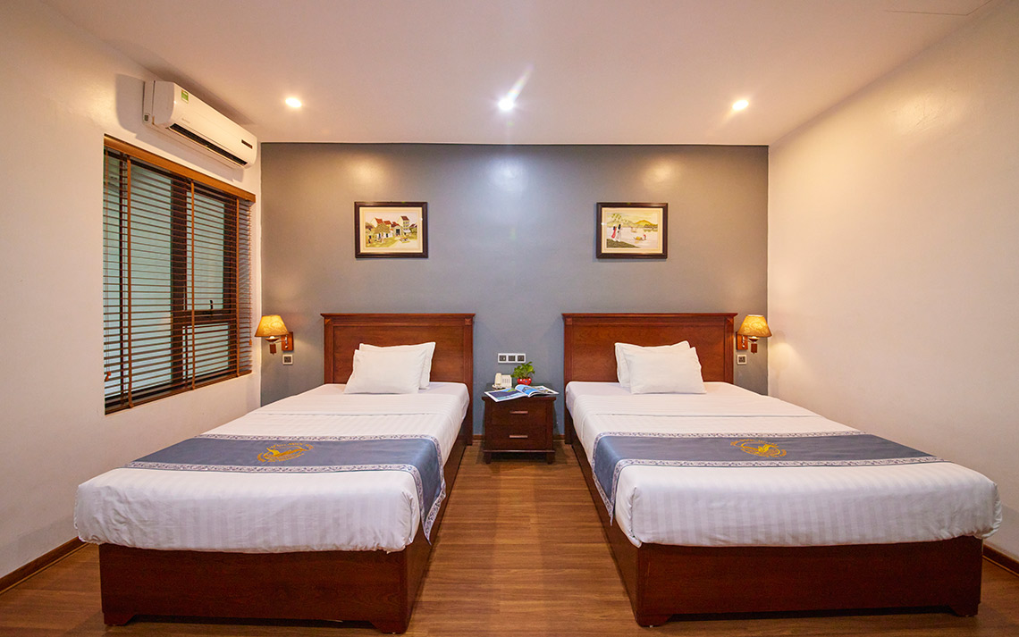 Phòng yên tĩnh và ấm áp có diện tích 23 - 28 m2 với của sổ nhìn ra phong cảnh cây xanh. Phòng được trang bị 2 giường ngủ kích thước 1.3 + 1.5m. Có thể nghỉ cho 3 người lớn + 2 trẻ em với mức phụ thu theo quy định của Khách sạn.